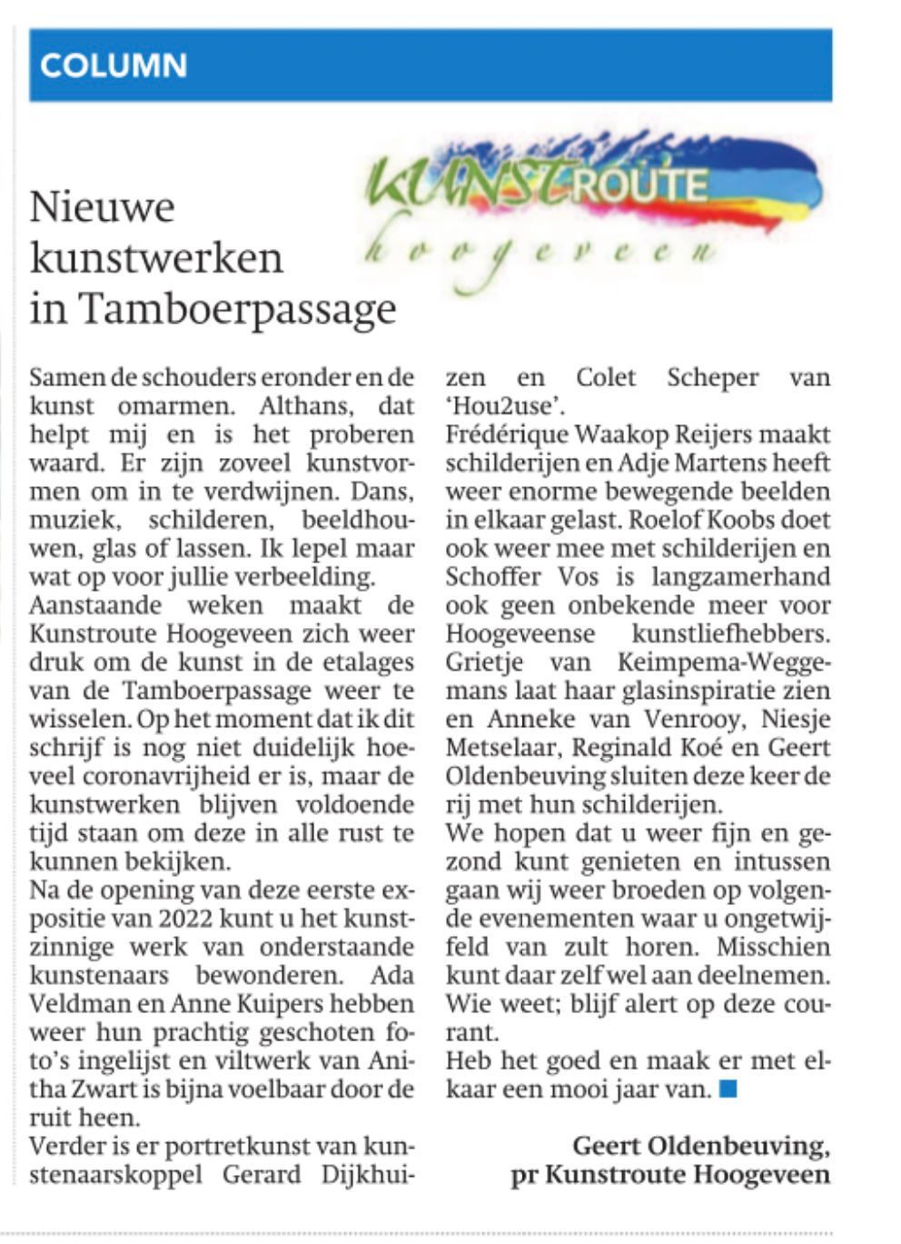 - Kunstroute Hoogeveen - van amateur tot professional (pdf),14 september 2022, Hoogeveensche Courant